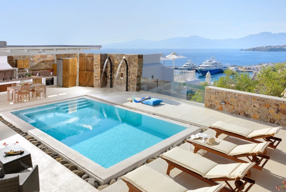 Villa Leonidas Mykonos is a superb, 2-bedroom luxury villa on Mykonos that offers the absolute best view of Mykonos Old Port, Mykonos Town, and the iconic Windmills. This villa encompasses sheer luxury and a refined style, located just a few steps from the town center.